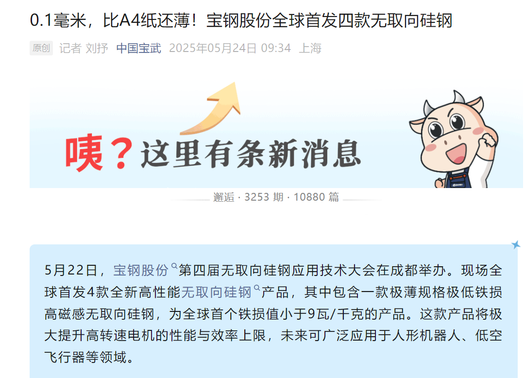 每经AI快讯,5月22日,宝钢股份第四届无取向硅钢应用技术大会在成都举办。现场全球首发4款全新高性能无取向硅钢产品,其中包含一款极薄规格极低铁损高磁感无取向硅钢,为全球首个铁损值小于9瓦/千克的产品。这款产品将极大提升高转速电机的性能与效率上限,未来可广泛应用于人形机器人、低空飞行器等领域。