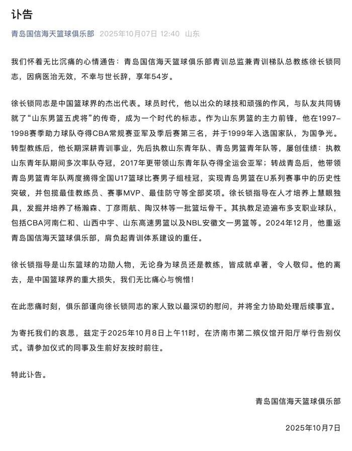 10月7日,青岛国信海天篮球俱乐部发布讣告:俱乐部青训总监兼青训梯队总教练徐长锁同志,因病医治无效,不幸与世长辞,享年54岁。在此悲痛时刻,俱乐部谨向徐长锁同志的家人致以最深切的慰问,并将全力协助处理后续事宜。