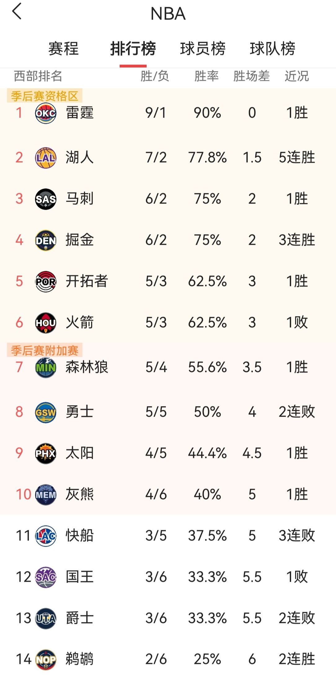 NBA常规赛继续进行(比赛均为NBA杯小组赛),联盟共安排了11场对决,其中西部焦点战就有5场,战况跌宕起伏堪称“疯狂周六”。火箭爆冷输给马刺,5连胜戛然而止,排名跌至西部第6;库里缺阵的勇士惨败于掘金诚信优配,遭遇2连败;独行侠不敌灰熊吞下四连败,稳坐西部倒数第一;拥有豪华阵容的快船位居西部第十,这两支球队的表现着实让人意外又失望。此外,36岁的威少创下历史纪录,却难阻国王不敌雷霆。下面就来详细看看今日的具体战况和西部最新排名: